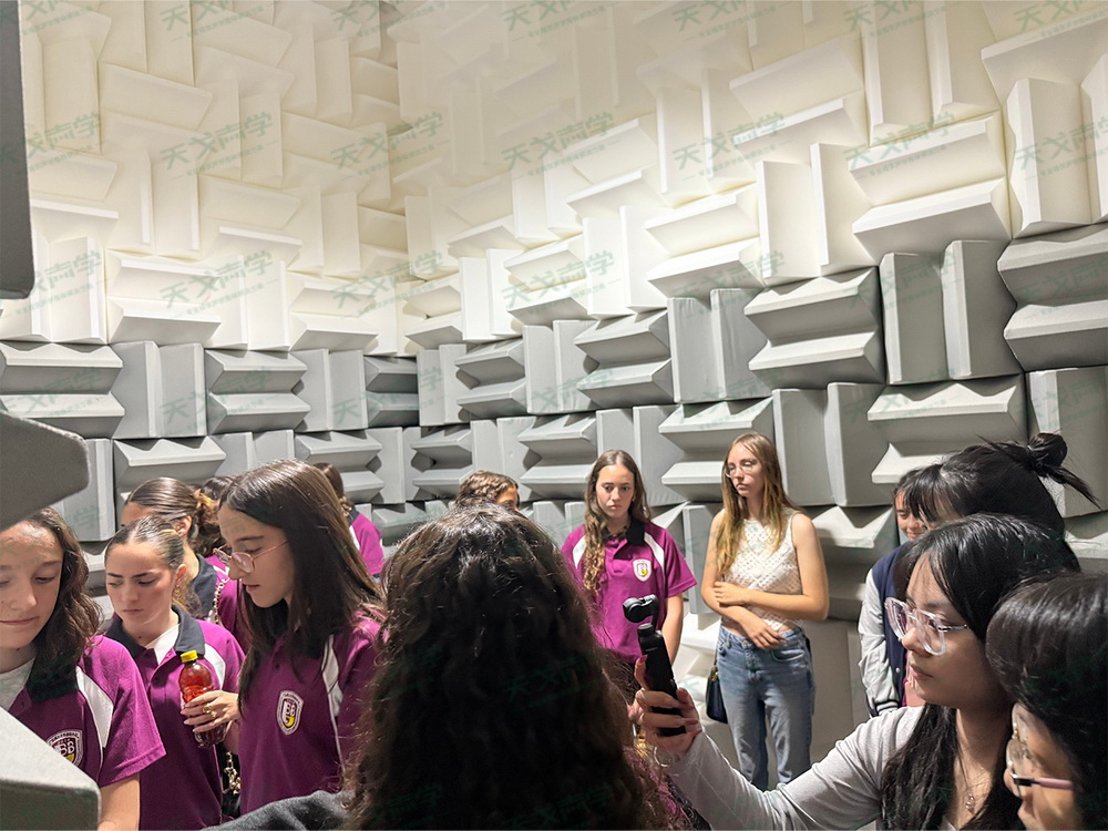 參觀過(guò)程中,天戈聲學(xué)集團(tuán)的科普講解員通過(guò)雙語(yǔ)講解、實(shí)物展示、互動(dòng)體驗(yàn)等多種形式,向西班牙師生們系統(tǒng)介紹了聲學(xué)原理、噪聲控制技術(shù)、聲學(xué)材料研發(fā)等專(zhuān)業(yè)知識(shí)。從聲學(xué)實(shí)驗(yàn)室的精密儀器演示,到實(shí)際應(yīng)用場(chǎng)景的案例解析,再到趣味聲學(xué)小游戲的現(xiàn)場(chǎng)互動(dòng),沉浸式的科普體驗(yàn)讓師生們直觀感受了聲學(xué)技術(shù)的魅力與應(yīng)用價(jià)值。代表團(tuán)成員們積極提問(wèn)、主動(dòng)交流,圍繞中西聲學(xué)教育、技術(shù)研發(fā)等話題展開(kāi)深入探討,現(xiàn)場(chǎng)氛圍熱烈融洽。