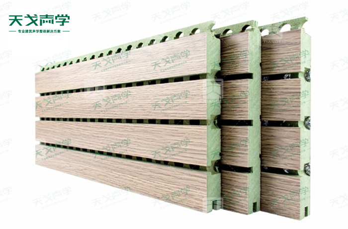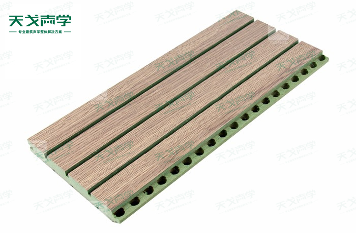 天戈防潮槽木吸音板是一種在密度板的正面開槽、背面穿孔的狹縫共振吸音材料。防潮槽木吸音板對(duì)吸聲頻譜選擇性很強(qiáng),對(duì)中低頻有很好的吸聲性能。若在吸聲結(jié)構(gòu)后空腔填入適量的吸聲棉可提高中、高頻吸聲效果,標(biāo)準(zhǔn)化模塊設(shè)計(jì),采用插槽、龍骨結(jié)構(gòu),安裝簡(jiǎn)易,常用于墻面或天花裝飾。