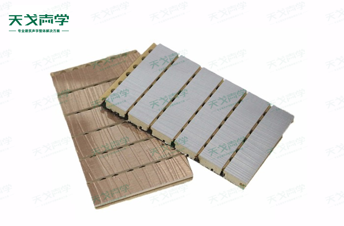 天戈多功能廳槽木吸音板是一種在密度板的正面開槽、背面穿孔的狹縫共振吸音材料。槽木吸音板對(duì)吸聲頻譜選擇性很強(qiáng),對(duì)中低頻有很好的吸聲性能。若在吸聲結(jié)構(gòu)后空腔填入適量的吸聲棉可提高中、高頻吸聲效果,標(biāo)準(zhǔn)化模塊設(shè)計(jì),采用插槽、龍骨結(jié)構(gòu),安裝簡(jiǎn)易,常用于墻面或天花裝飾。
