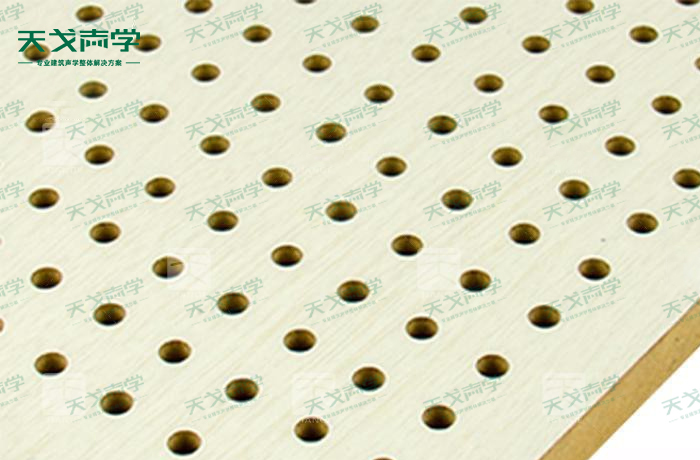 天戈孔狀吸音板飾面顏色及材料選擇性廣,孔徑、孔距可根據客戶要求調整,能很好地滿足客戶多樣化的聲學及裝飾需求。孔木吸音板對吸聲頻譜選擇性較強,對中低頻有很好的吸聲性能。如在吸聲結構后空腔上填入適量的吸聲棉可提高中、高頻吸聲效果。