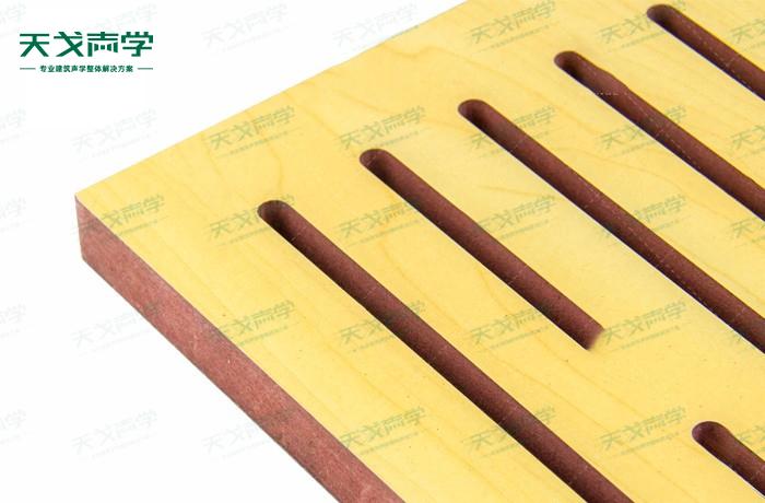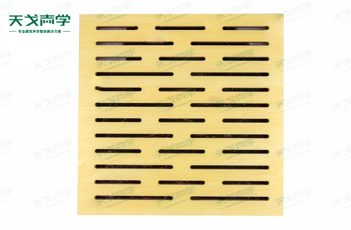 天戈U型孔孔木吸音板飾面顏色及材料選擇性廣,孔徑、孔距可根據客戶要求調整,能很好地滿足客戶多樣化的聲學及裝飾需求。孔木吸音板對吸聲頻譜選擇性較強,對中低頻有很好的吸聲性能。如在吸聲結構后空腔上填入適量的吸聲棉可提高中、高頻吸聲效果。