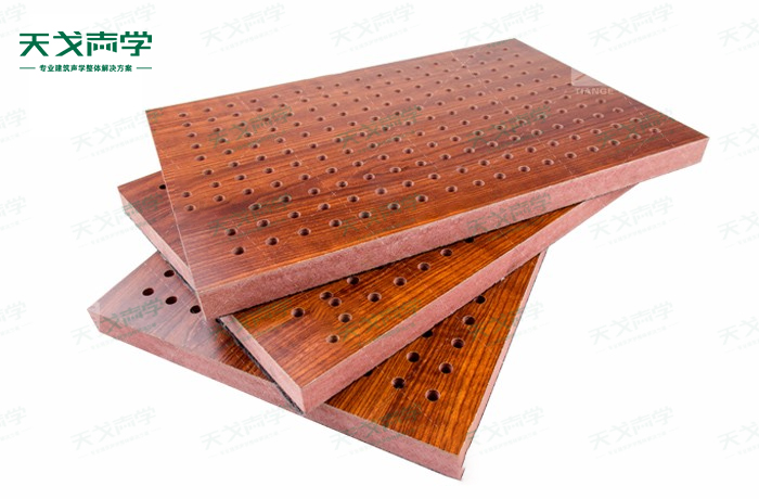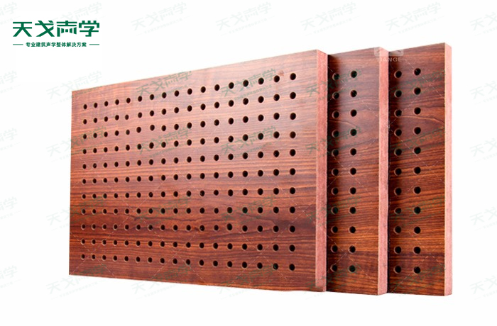 天戈會議室孔木吸音板飾面顏色及材料選擇性廣,孔徑、孔距可根據客戶要求調整,能很好地滿足客戶多樣化的聲學及裝飾需求。孔木吸音板對吸聲頻譜選擇性較強,對中低頻有很好的吸聲性能。如在吸聲結構后空腔上填入適量的吸聲棉可提高中、高頻吸聲效果。