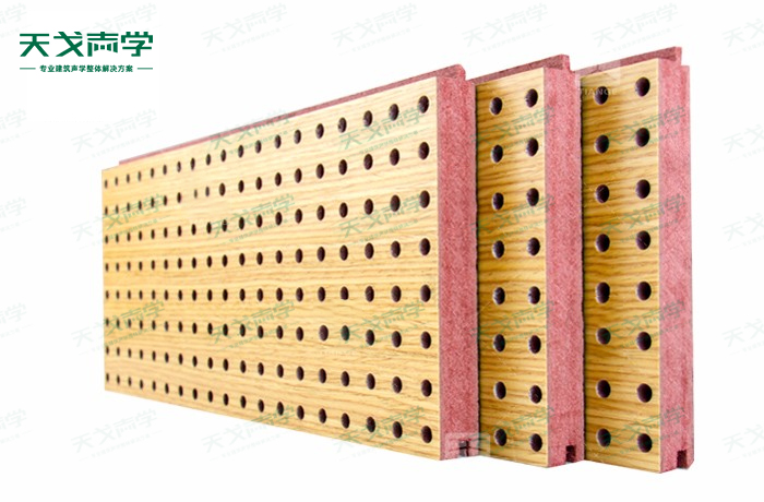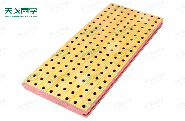 天戈阻燃孔木吸音板飾面顏色及材料選擇性廣,孔徑、孔距可根據客戶要求調整,能很好地滿足客戶多樣化的聲學及裝飾需求。孔木吸音板對吸聲頻譜選擇性較強,對中低頻有很好的吸聲性能。如在吸聲結構后空腔上填入適量的吸聲棉可提高中、高頻吸聲效果。