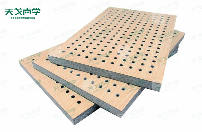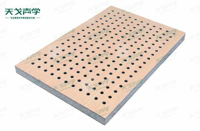 天戈玻鎂防火吸音板飾面顏色及材料選擇性廣,孔徑、孔距可根據客戶要求調整,能很好地滿足客戶多樣化的聲學及裝飾需求。孔木吸音板對吸聲頻譜選擇性較強,對中低頻有很好的吸聲性能。如在吸聲結構后空腔上填入適量的吸聲棉可提高中、高頻吸聲效果。