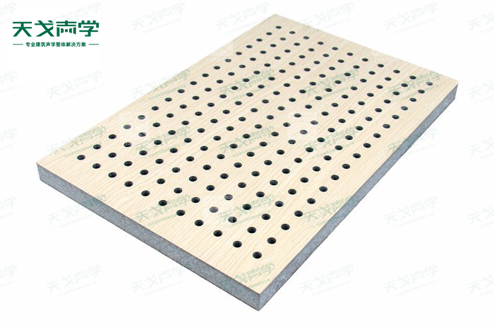 天戈玻鎂板孔木吸音板飾面顏色及材料選擇性廣,孔徑、孔距可根據客戶要求調整,能很好地滿足客戶多樣化的聲學及裝飾需求。孔木吸音板對吸聲頻譜選擇性較強,對中低頻有很好的吸聲性能。如在吸聲結構后空腔上填入適量的吸聲棉可提高中、高頻吸聲效果。