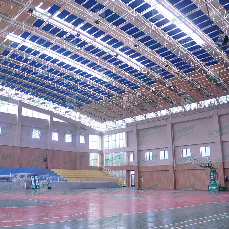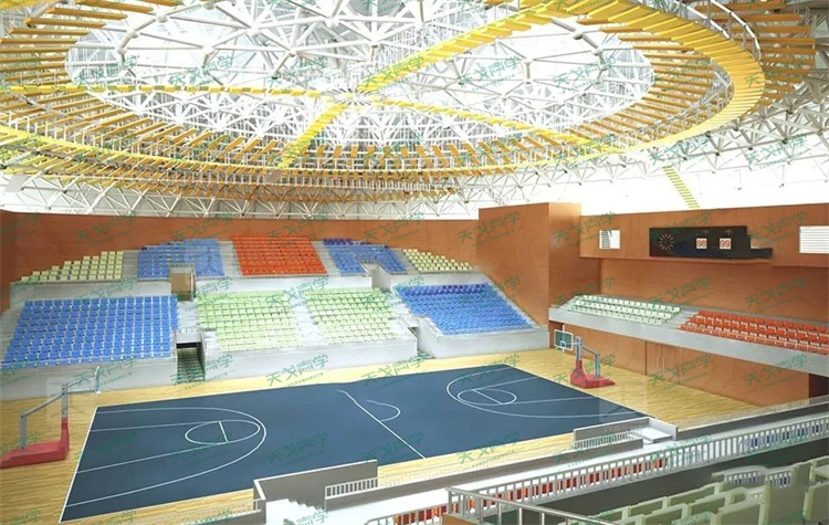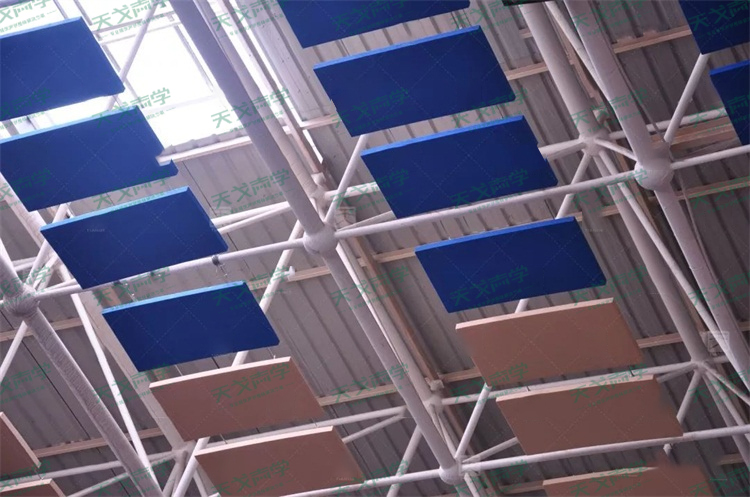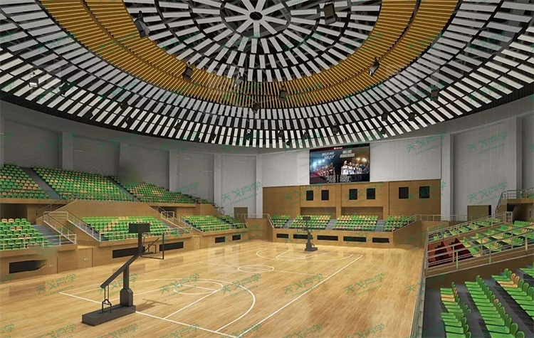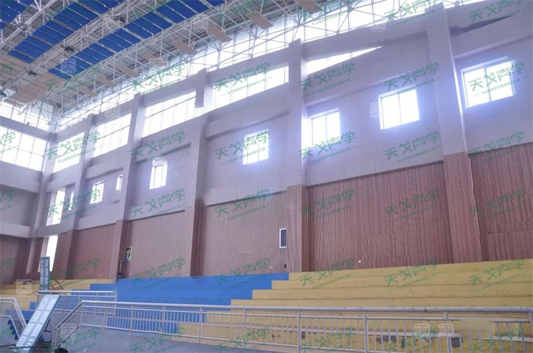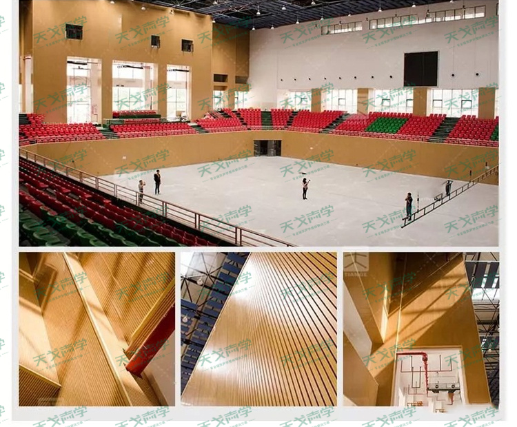 一般來說,由于體育館的的容積較大,平均自由程較長,混響時間過長,所以存在問題多為聲聚焦、回聲、多重回聲等音質缺陷。為此,聲學環境整體解決方案服務商天戈聲學為山東諸城第一中學體育場項目提供了空間吸聲體、槽木吸音板以及聚酯纖維吸音板作為主要的吸音材料。