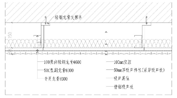 結構:50mm厚吸聲棉包+吸聲黑氈+槽鋁吸音板