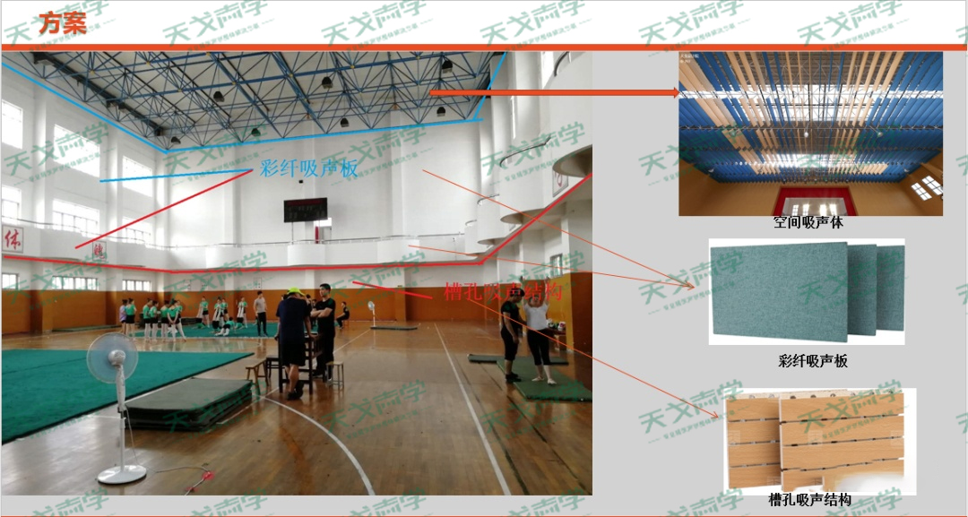 不同的體育館存在的聲學問題有一定的差異,天戈聲學的設計師根據連云港藝術學校體育館的具體情況為其提供了專業的聲學設計方案。方案確定了體育館使用的聲學材料,以及聲學材料的安裝位置。