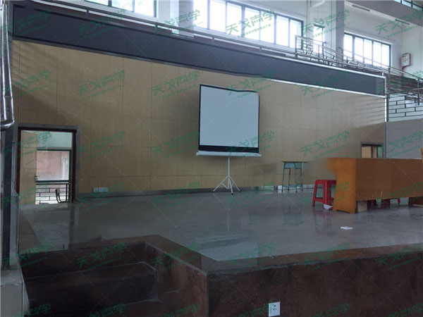 因?yàn)楣て诒容^趕,我方全力配合學(xué)校的要求加快施工進(jìn)度和聲學(xué)材料生產(chǎn),施工過(guò)程中也遇到些困難,當(dāng)時(shí)考慮安裝天花的聲學(xué)材料是高空作業(yè)要搭建滿堂架才能施工,但是搭建滿堂架去施工成本就會(huì)大大的增加,最后由我們專業(yè)的技術(shù)團(tuán)隊(duì)解決了此問(wèn)題,再?zèng)]有搭建滿堂架的基礎(chǔ)上安全 保質(zhì)的完成了天花空間吸聲體的施工,保證了效果也給校方節(jié)省了成本。