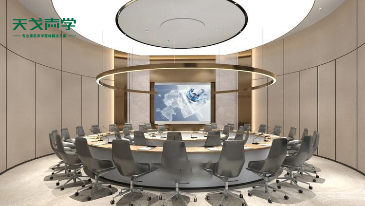 圓桌會(huì)議廳位于建筑二層,平面造型為圓形,圓形造型容易產(chǎn)生聲聚焦。要求混響時(shí)間達(dá)到1.3s-1.5s,需確保會(huì)場(chǎng)有足夠的響度、清晰度以及均勻的聲場(chǎng)效果,且需在15天時(shí)間內(nèi)完成工程施工。