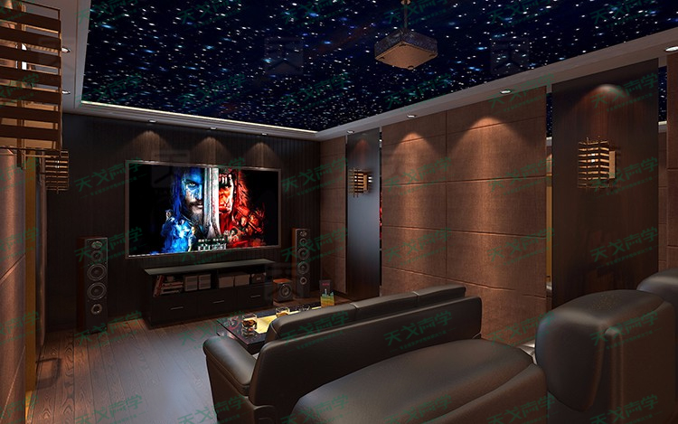 兩側墻采用的是天戈軟包吸音板,突出房間的層次感,頂面加以星空造型,兩者搭配整體格局相得益彰,不僅使整個房間吸音效果達到一個很好的層次,而且兩者搭配的裝修效果也完美融合。整個家庭影院所呈現(xiàn)出來的是,簡約清晰中又不失專業(yè)和大氣,低調中彰顯霸氣。