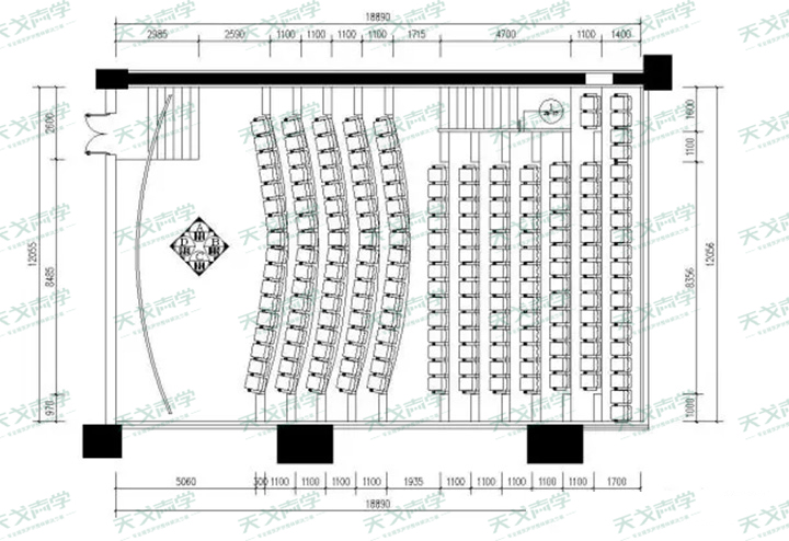 觀眾廳的后墻面應(yīng)采用防止回聲的寬頻帶強(qiáng)吸聲結(jié)構(gòu)。其平均系數(shù)在125-4000Hz范圍內(nèi)不易小于0.6s,125Hz的吸聲系數(shù)不宜小于0.4s??紤]到電影院的整體性,宜采用25mm厚布藝吸音板,進(jìn)行各頻段吸音。