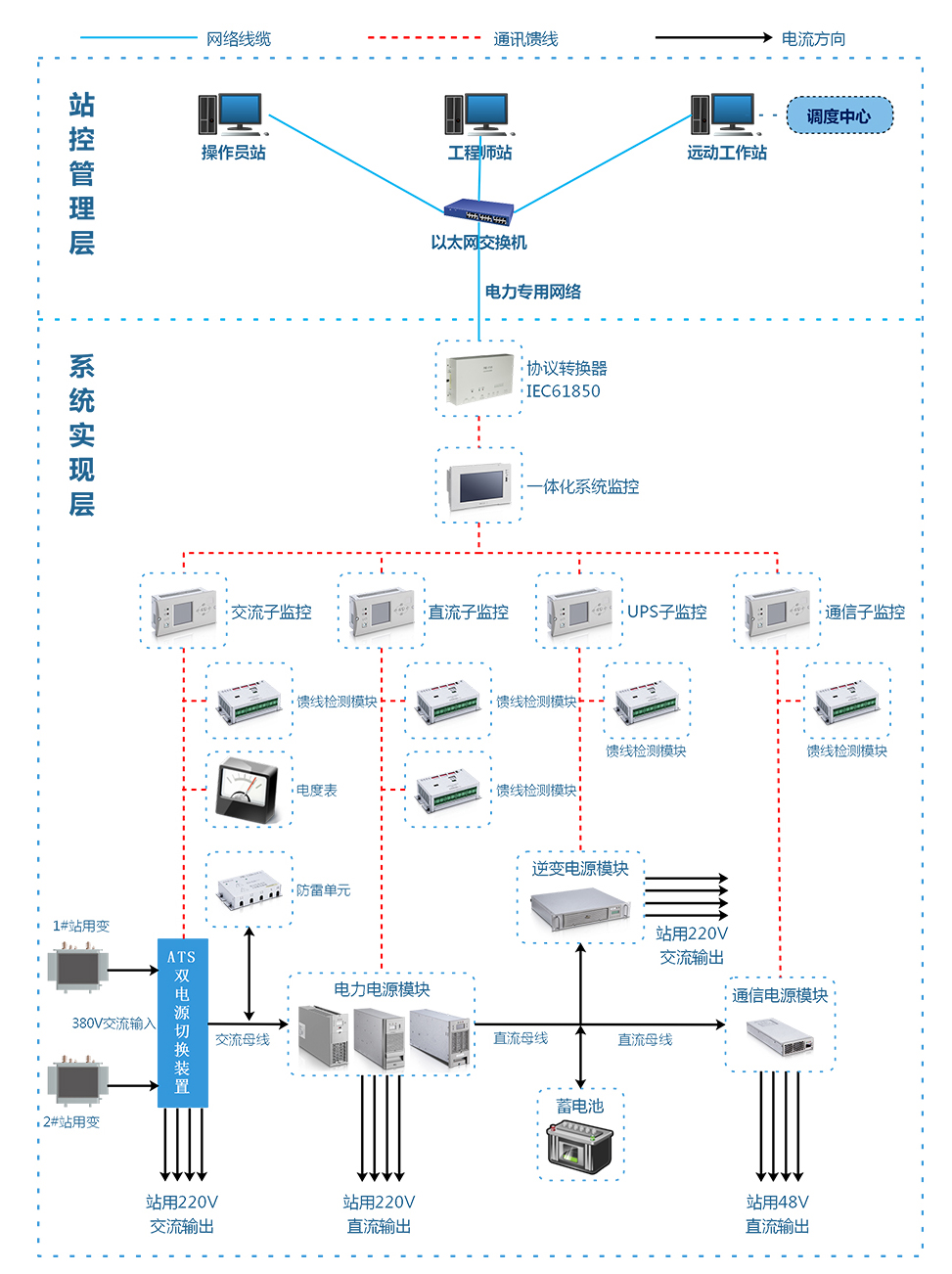 一體化電源系統(tǒng)采用分散控制系統(tǒng),模塊化結(jié)構(gòu),組屏簡單,配置靈活,統(tǒng)一化管理,冗余備份方式,極大的提高了系統(tǒng)的可靠性。